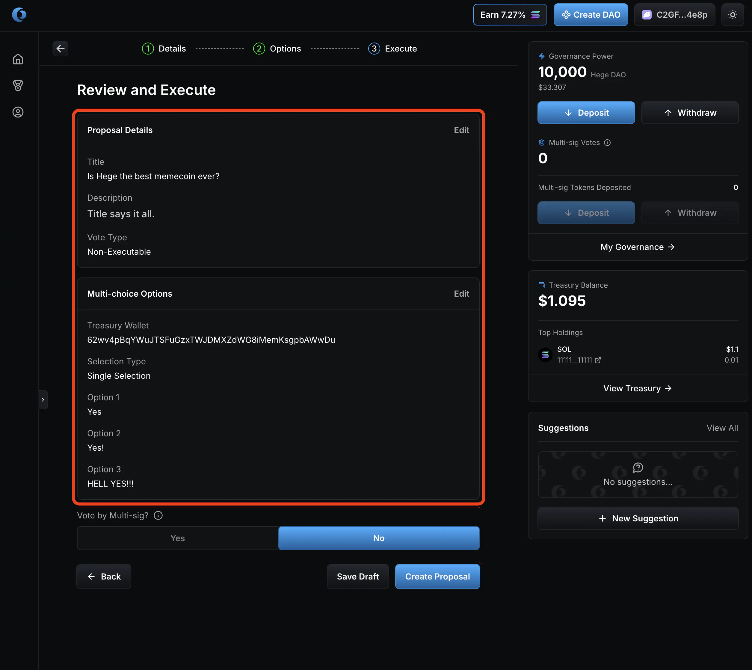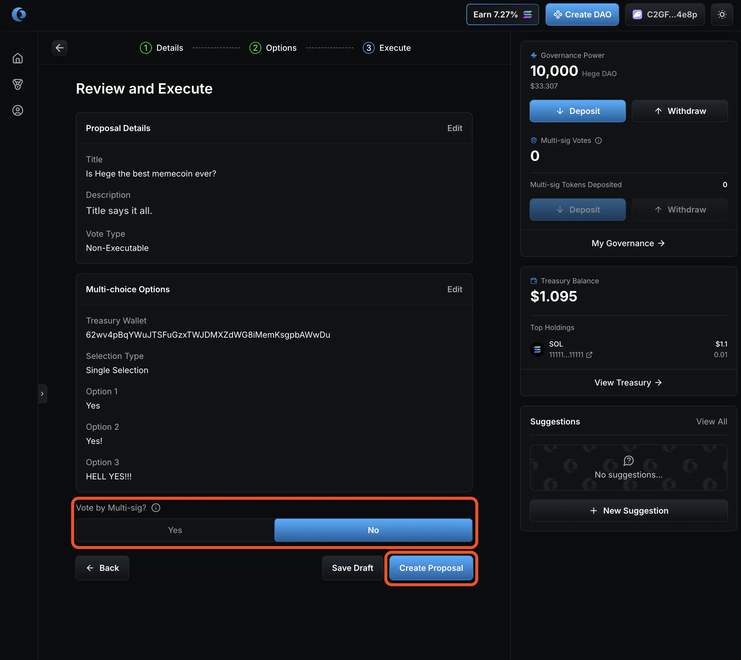 - Select “No” on vote by multi-sig. Then click “Create Proposal”.