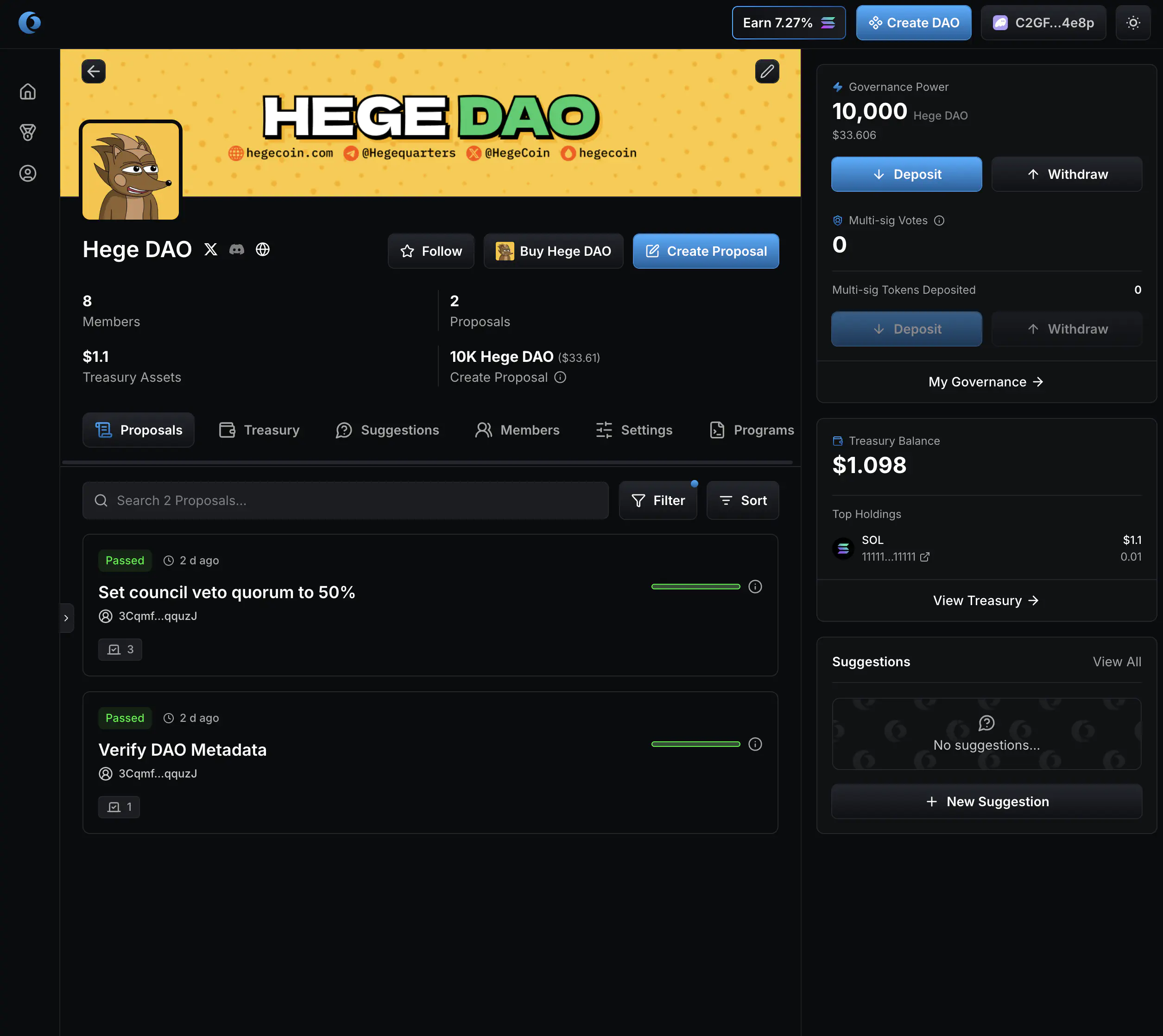 - Go to the Hege DAO page on Realms. Connect your wallet. It should look something like this. You can see how many $HEGE tokens you have deposited in the upper right corner, right next to the banner. (NOTE: You must have at least 10,000 $HEGE deposited to make a proposal. See How to Deposit and Withdraw to learn how to deposit tokens.)