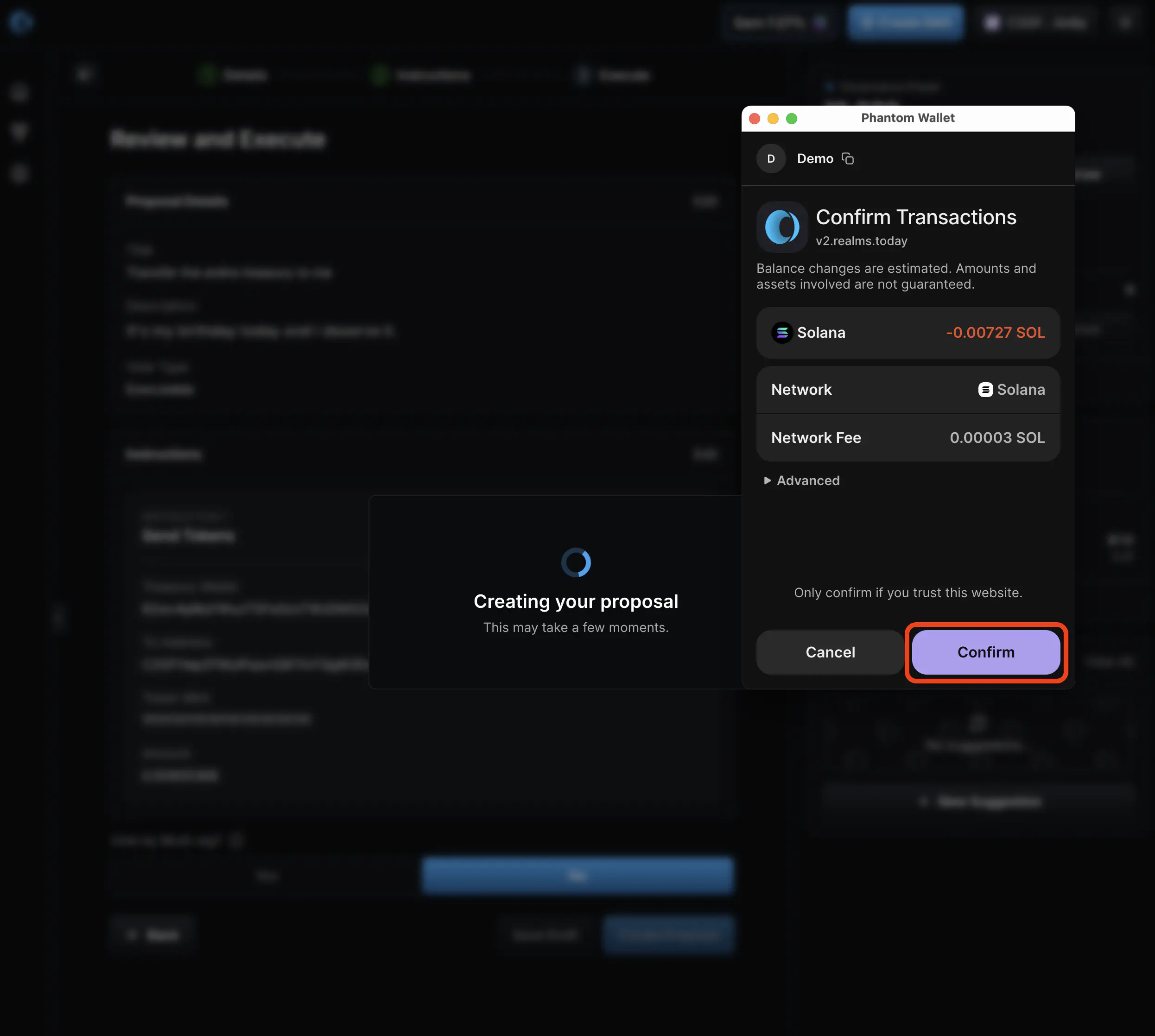 - Confirm the transaction in your Solana wallet.