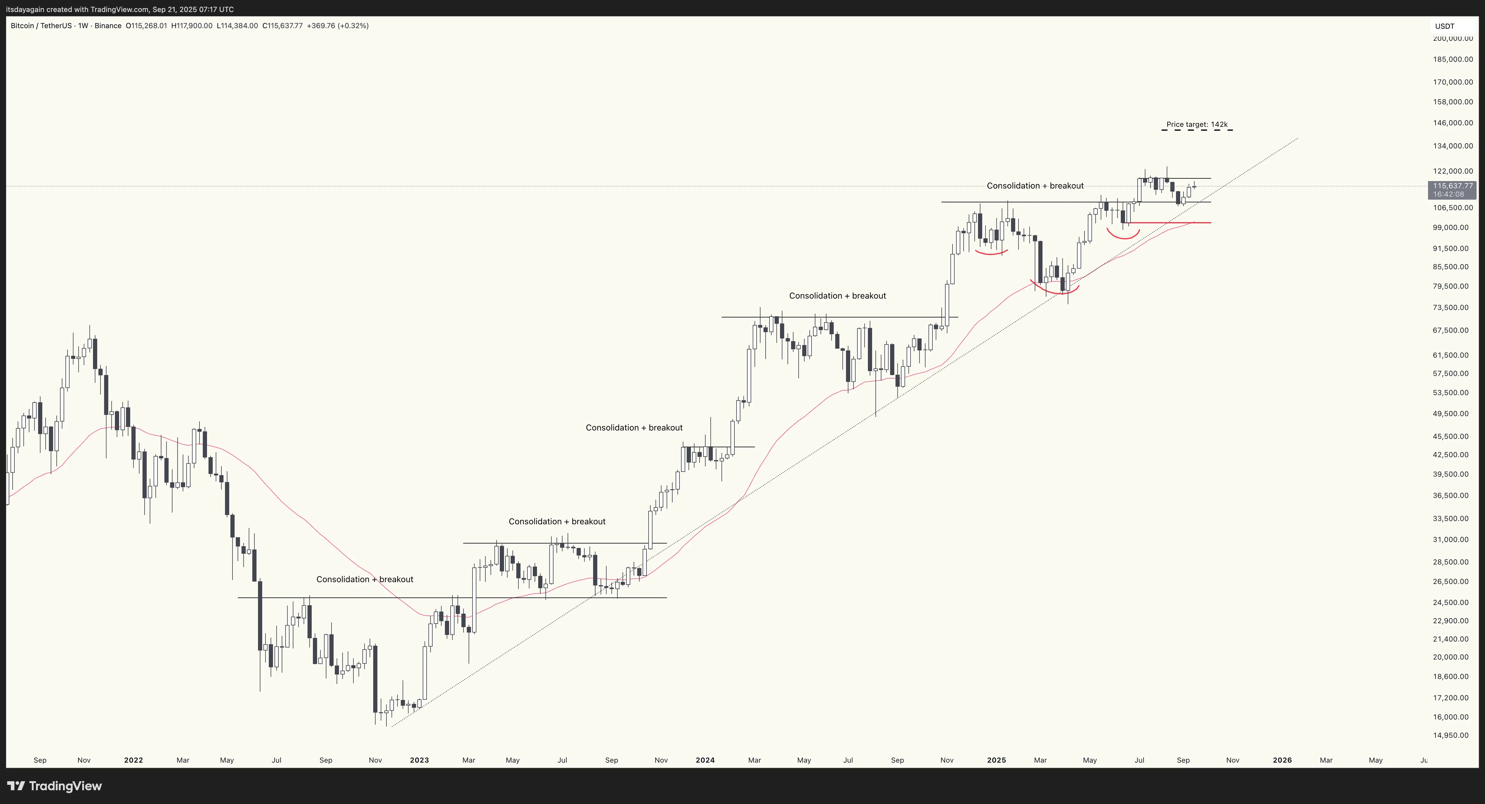 On the crypto side, bitcoin is lagging a little bit behind, still working on breaking through resistance around 117k. But the chart still looks good, and it’s likely only a matter of time before it breaks through, and moves on to new all time highs, possibly some time in October. The price target on the weekly chart remains at 142k.