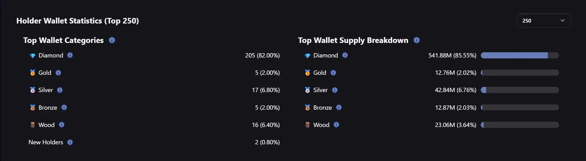 Out of the top 250 holders, 81% are diamond handed, together controlling 73% of the supply. (And this is even after removing the big CEX wallets from the calculation.)