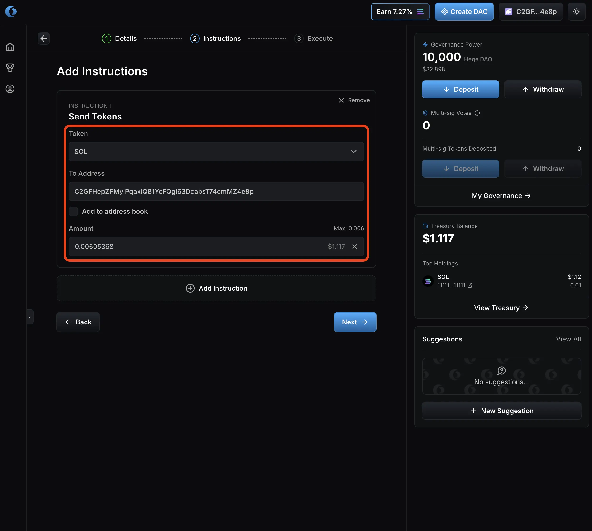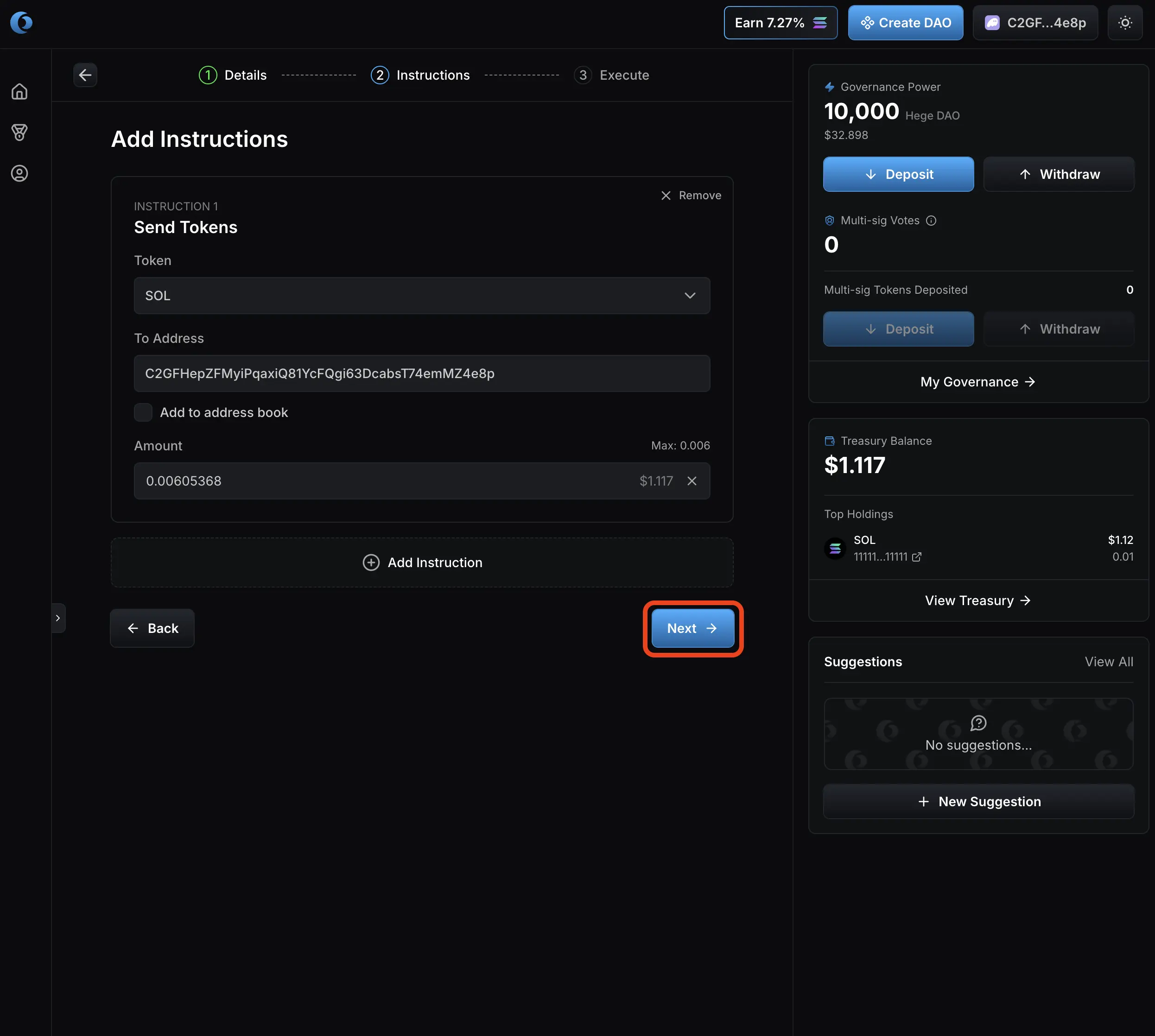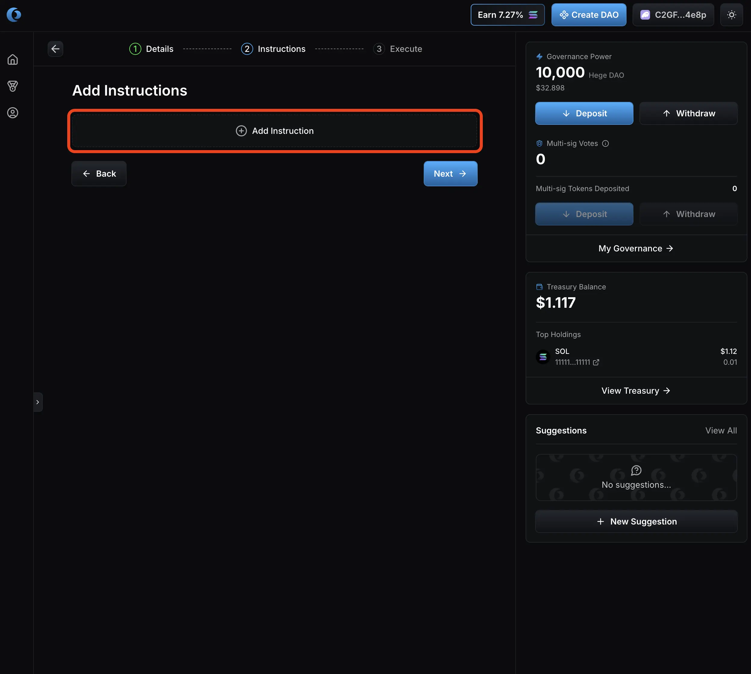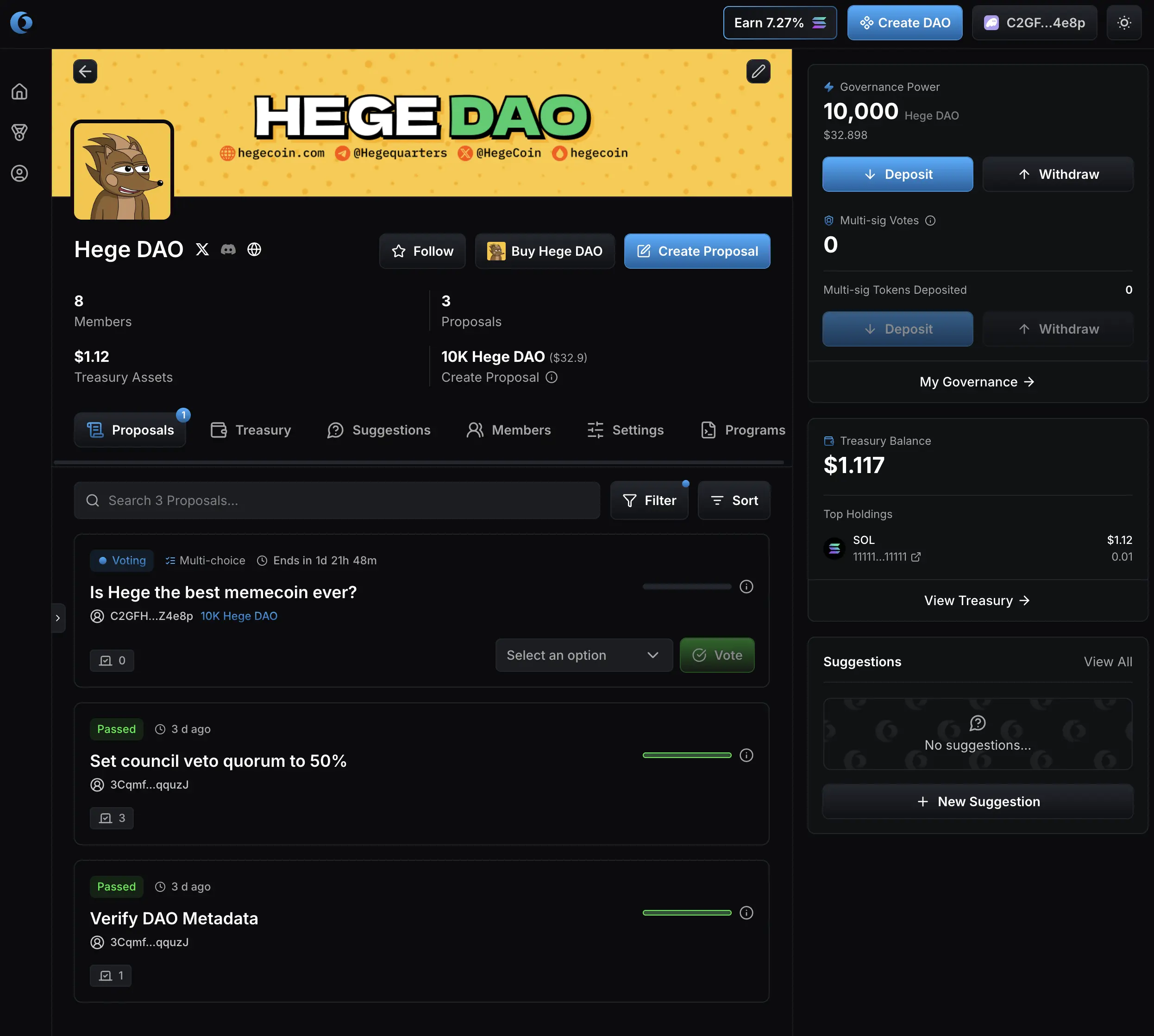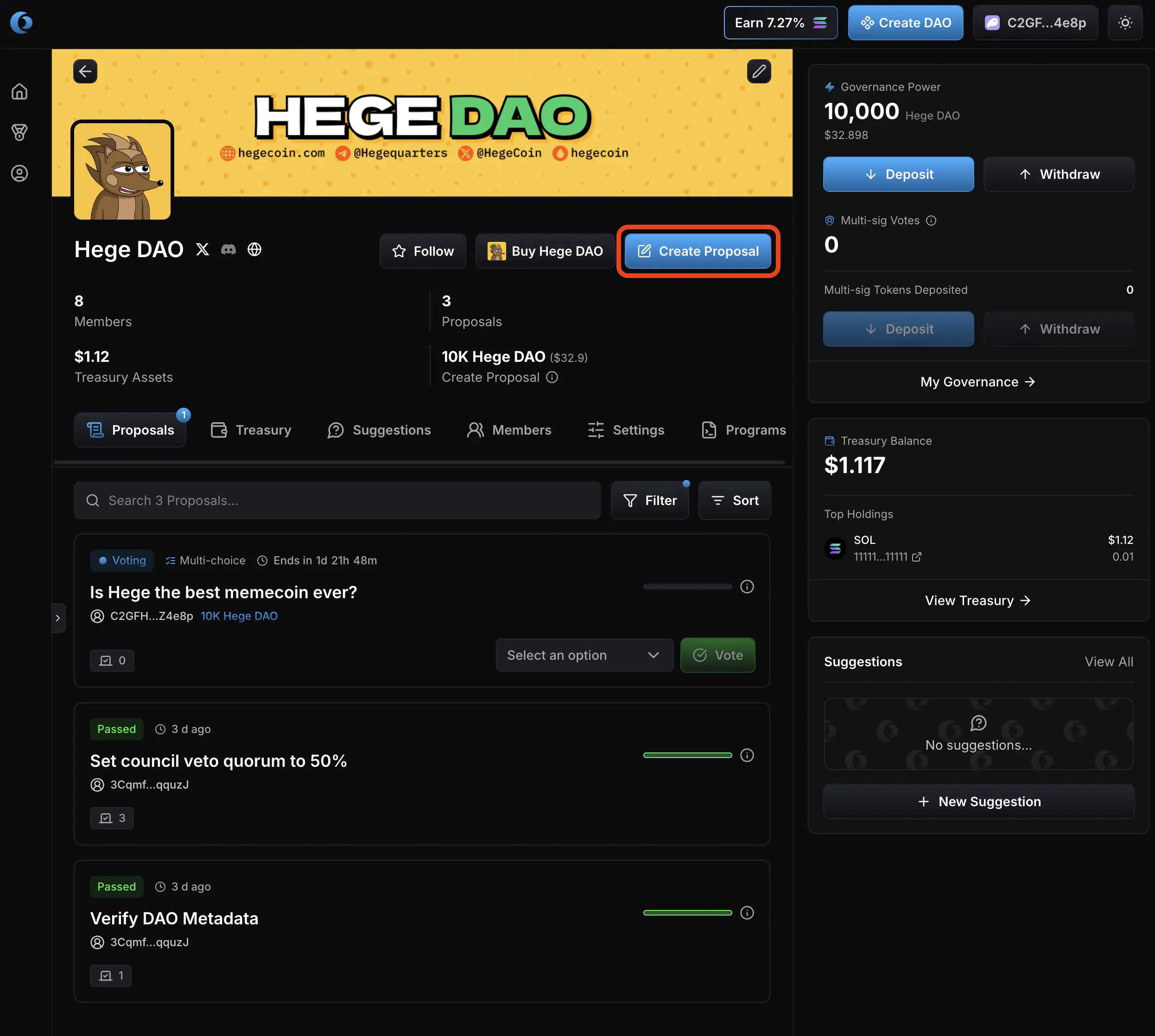 1. Go to the Hege DAO page on Realms. Connect your wallet. It should look something like this. You can see how many $HEGE tokens you have deposited in the upper right corner, right next to the banner. (NOTE: You must have at least 10,000 $HEGE deposited to make a proposal. See How to deposit and withdraw to learn how to deposit tokens.)