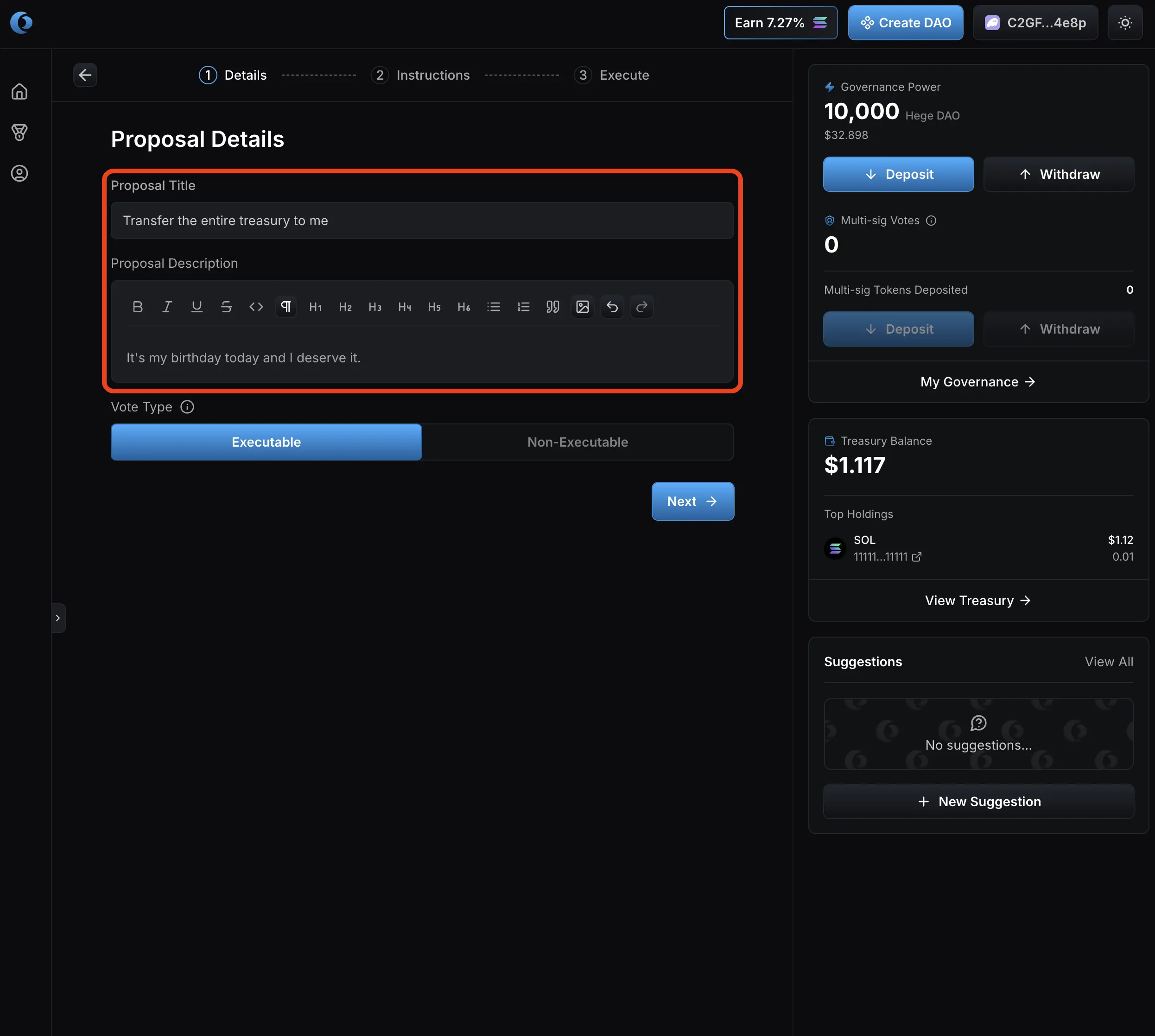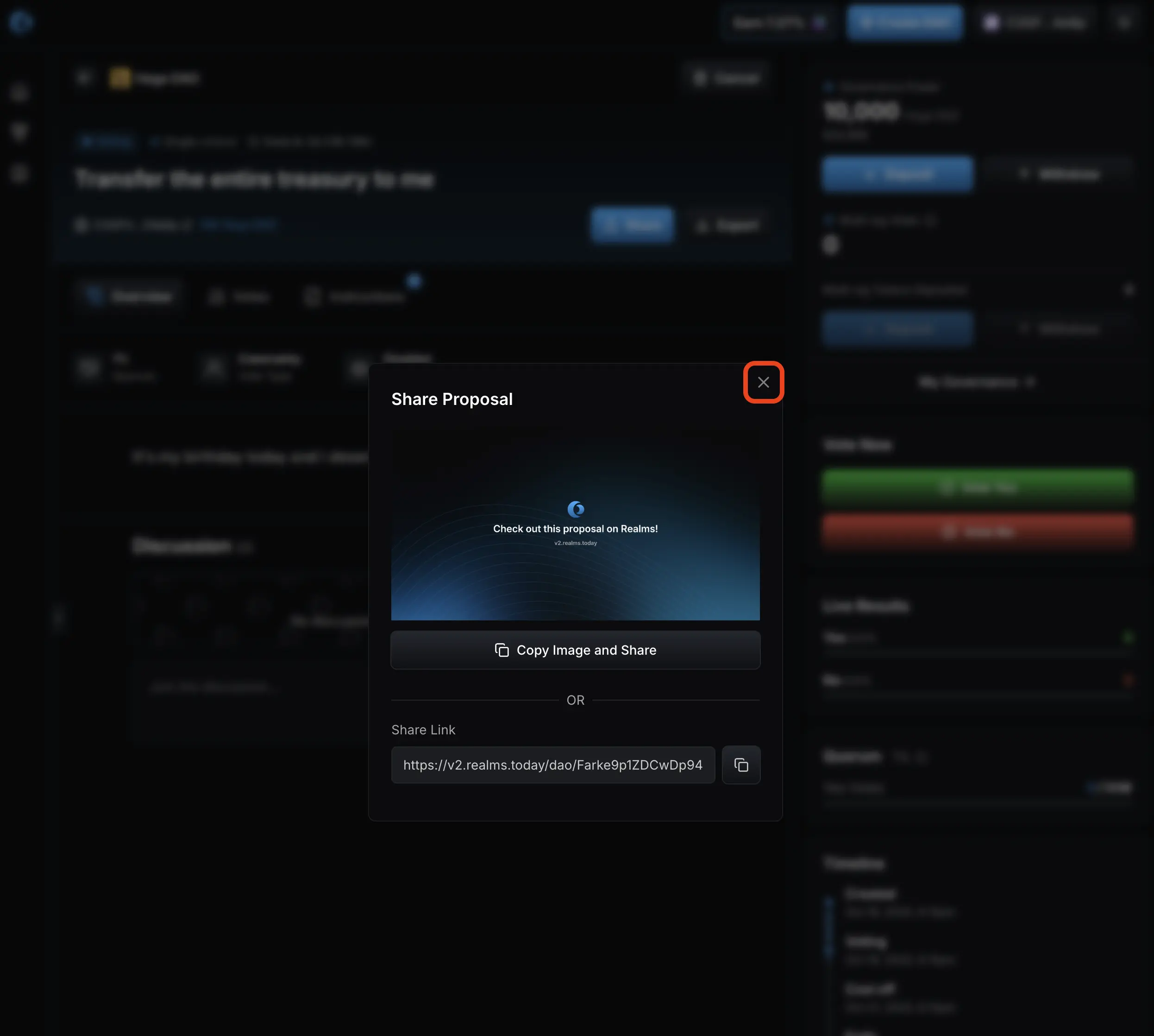 13. That's it! Your proposal is created and open for voting. Now go share it with the Hege community! And don't forget to vote on your proposal. See How to vote in the Hege DAO if you need help with that.