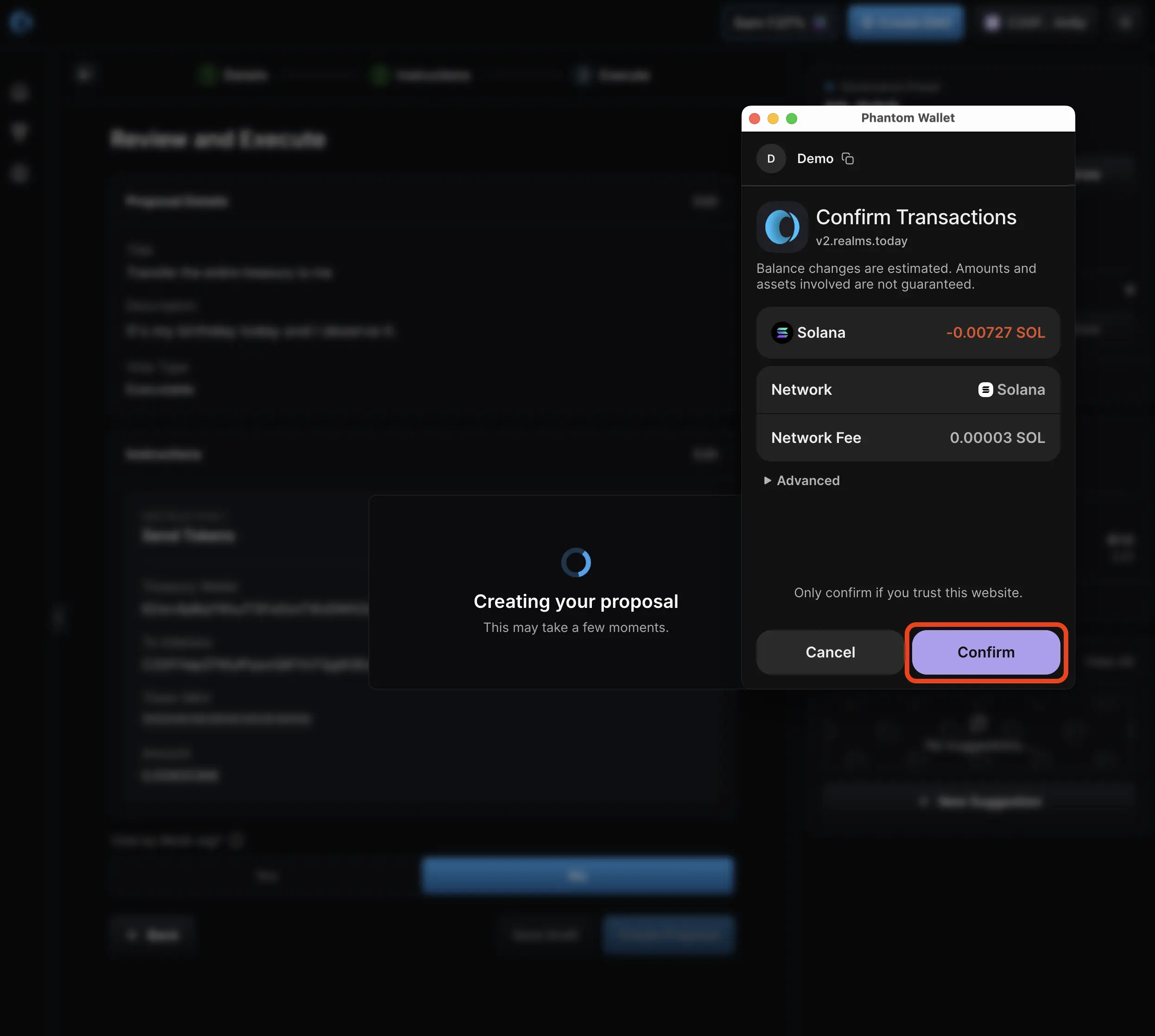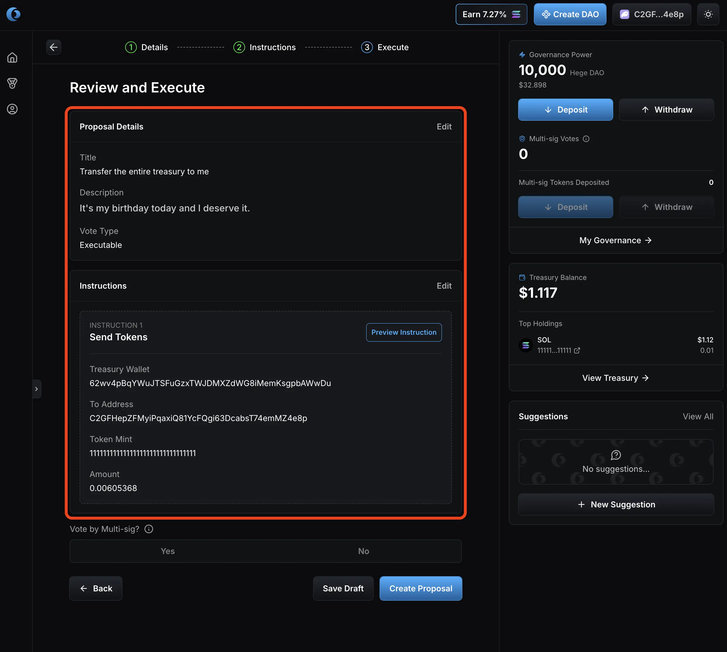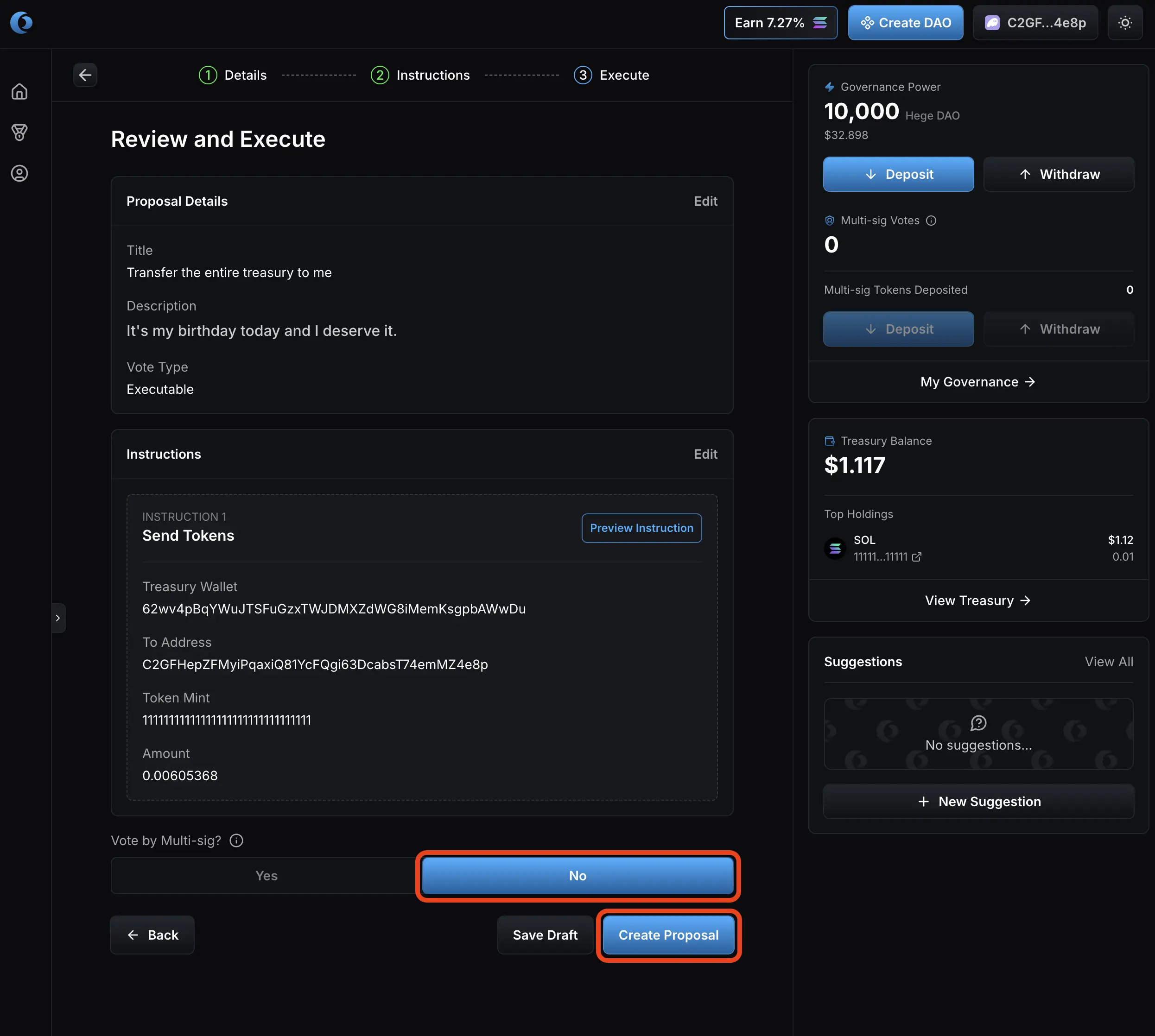 10. Select "No" on vote by multi-sig. Then click "Create Proposal".