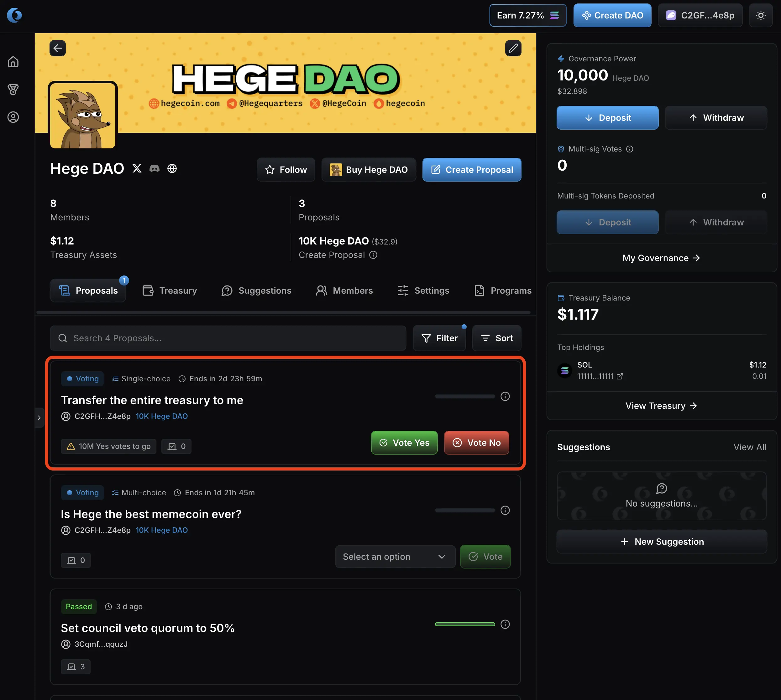 11. You now see a page showing information about your proposal. Go back to the main page of the Hege DAO by clicking on "Hege DAO" in the upper left corner of the page.